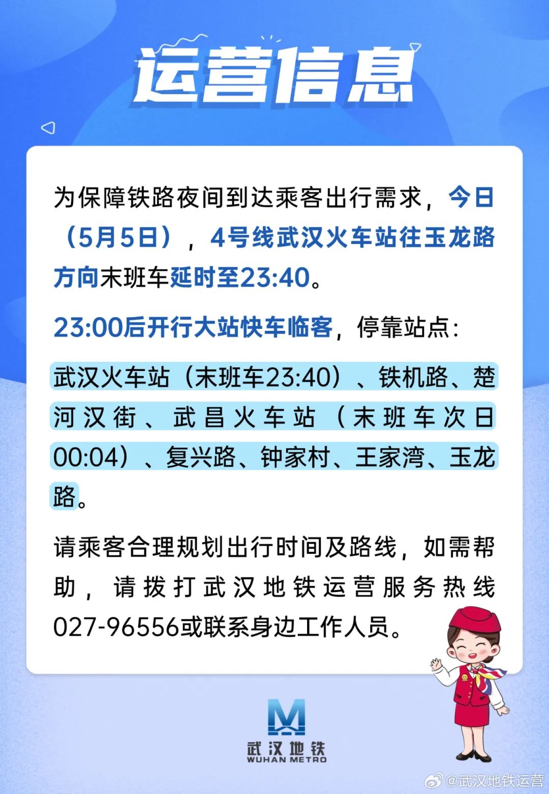 5月4日,武汉地铁运营有限公司官方微博账号发布运营信息表示,为保障铁路夜间到达乘客出行需求,5月5日,4号线武汉火车站往玉龙路方向末班车延时至23:40。